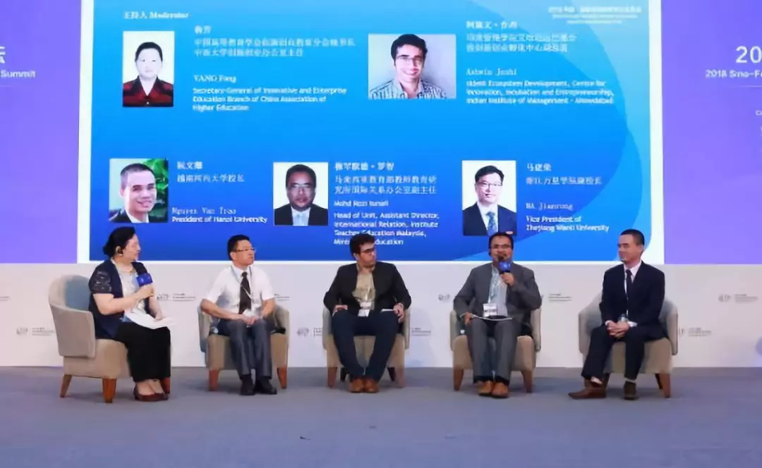从左至右:浙江万里学院副校长马建荣、印度管理学院艾哈迈达巴德分校创新创业孵化中心副总监阿什文.乔西、马来西亚365bet亚洲版官方_约彩365安卓版本_365bet体育投注地址部教师365bet亚洲版官方_约彩365安卓版本_365bet体育投注地址研究所国际关系办公室副主任默罕默德·罗智、越南河内大学校长阮文潮参与讨论